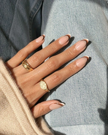 Первый дизайн, что приходит в голову — кофейный французский маникюр. Нейл-арт в коричневых оттенках выглядит необычно, но не так вызывающе, как френч в черных оттенках. Сделать такой дизайн можно как на длинных, так и на коротких ногтях любой формы. Оттенок также можно выбрать любой: от коричневого до светло-карамельного.