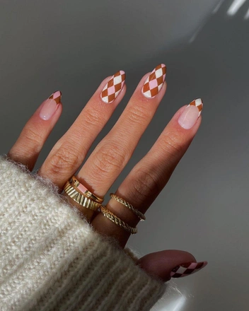 Фанатам необычных нейл-артов понравится идея шахматного дизайна в коричневых оттенках. С клеткой можно сочетать другие дизайны или использовать для маникюра разные оттенки лаков. Чтобы не переборщить, лучше не выбирать яркие цвета, которые сделают маникюр чересчур пестрым.