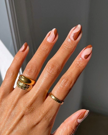 Еще один модный дизайн в коричневых оттенках — абстрактные линии. Нейл-арт можно сделать как в одном оттенке, так и сочетать в нем несколько цветов в кофейном гамме: от темно-коричневого до молочного. С идеей дизайна также можно экспериментировать, например, сделать ассиметричные узоры по прозрачной базе или попробовать градиентный френч.
