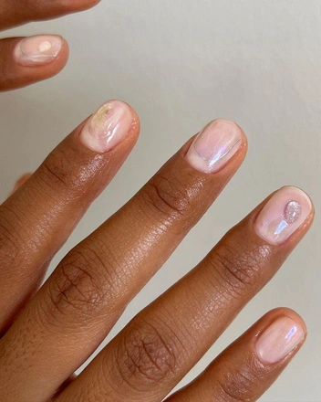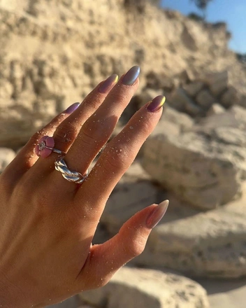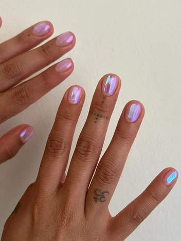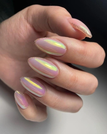 Если разноцветный маникюр вам не по душе, присмотритесь к более лаконичному варианту «ногтей-ракушек». Вы можете дополнить втиркой или топом с мелкими блестками любое однотонное покрытие. Благодаря блестящему финишу ногти будут красиво переливаться в лучах солнца, но при этом не станут привлекать к себе много внимания.