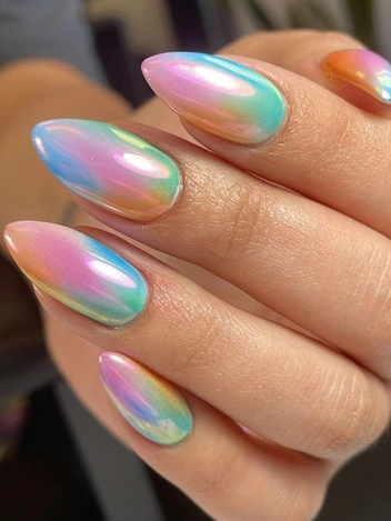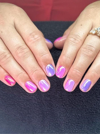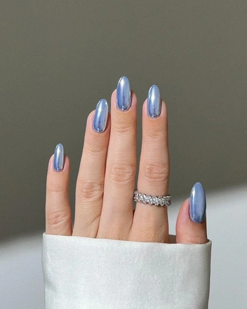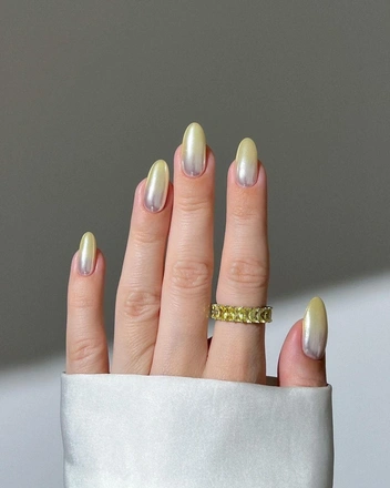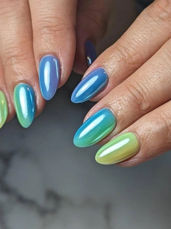 Сперва может показаться, что дизайн — это еще один виток любимого многими хромированного (или глазированного) маникюра. Однако к сияющему финишу в этом дизайне добавляется градиент, в котором можно сочетать несколько оттенков сразу. Это могут быть как спокойные и нежные комбинации пастельных лаков, так и более необычные сочетании контрастных цветов.