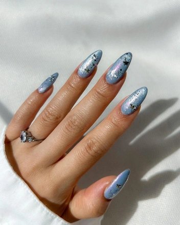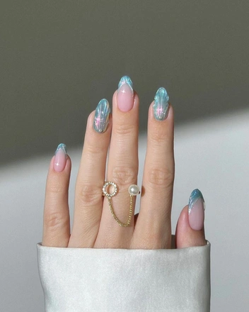 Присмотритесь к нейл-арту в голубых оттенках, если подбираете себе маникюр в отпуск (читайте также: Отрастает незаметно: 7 идей маникюра, который будет хорошо выглядеть весь отпуск). Нежный голубой лак в сочетании с сияющей втиркой напоминает одновременно и ракушки, и жемчуг. Такой маникюр подойдет как для длинных, так и для коротких ногтей любой формы. А разнообразить его можно с помощью небольших наклеек или узоров.