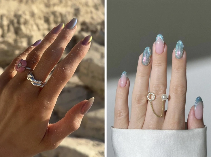 Дополнить «ногти-ракушки» можно с помощью объемных элементов. Попросите мастера создать на ногтях текстуру ракушки, 3D-жемчужины и другие украшения в морской тематике. В сочетании с дуохромным покрытием от объемного нейл-арт будет невозможно оторвать взгляд. Особенно красиво такой маникюр будет выглядеть на длинных ногтях.