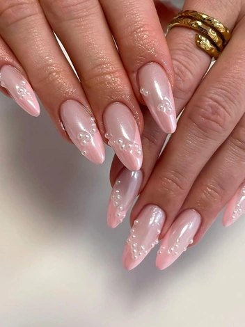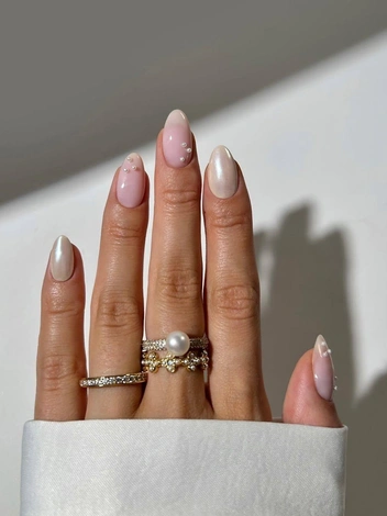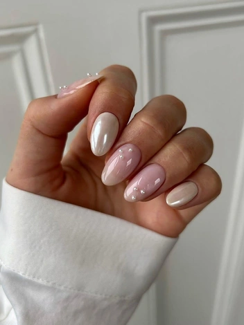 Жемчужный маникюр имитирует нежное мерцание жемчуга, создавая эффект благородного свечения. Достигается он, как правило, путем использования специальных перламутровых лаков, порошков-втирок или гелей с добавлением микрочастиц, имитирующих жемчужный блеск. Цветовая палитра варьируется от классического белого и кремового до нежно-розового, повторяя многообразие оттенков натурального жемчуга.