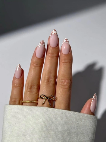 Нюдовый маникюр 2025 года неожиданно предлагает и флористический дизайн. Согласитесь, в любом исполнении он выглядит нежно и женственно. Но самым интересным является цветочный френч, который предполагает добавление цветочных узоров прямо на белую дугу. Для создания наибольшей контрастности на ногтях отдавайте предпочтение цветам шоколадных, фиолетовых, темно-синих оттенков. Если же хочется получить более утонченный дизайн, то попробуйте добавить мелкую цветочную россыпь на края ногтей без прорисовывания характерной французскому маникюру линии.