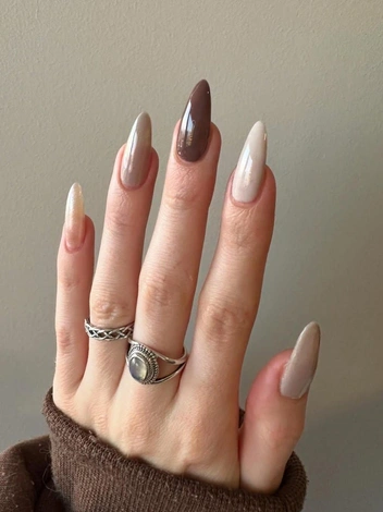 Есть стереотип, что нюдовый маникюр — это всегда пастельная гамма, нежные оттенки и тона. Но нюдовый маникюр 2025 года разрешает поступиться этими правилами. Для любительниц темных дизайнов тоже есть не менее интересный вариант в стиле кофейного напитка. Маникюр «мокко», выполненный в коричневых оттенках, выглядит так, словно ноготки окунули в кофе, а затем шоколадные капли растянули по всей площади ногтевой пластины. Получается интересное кофейно-молочное омбре.