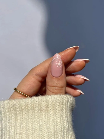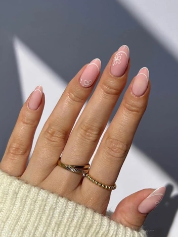 Плавные белые линии на нюдовом покрытии, акцентные цветочные узоры и россыпь мельчайших точек — все это делает маникюр максимально утонченным и изящным. В нем нет лишних деталей — все сочетается гармонично.