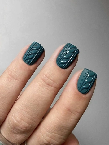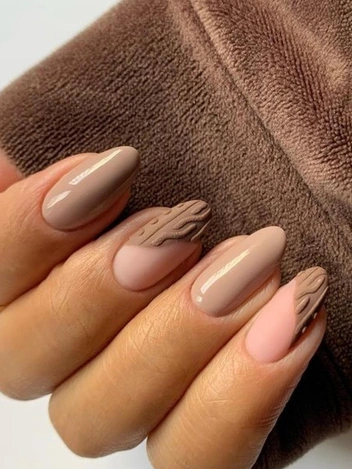 Несмотря на то, что такой дизайн обычно выполняют в нежных нюдовых или пастельных оттенках, сейчас его рекомендуют делать в шоколадных оттенках. Но наш совет вообще забыть про вязаный узор, это уже не очень актуально и не совсем в тренде. Тем более, что акриловая лепка в этом сезоне — это уже моветон, поэтому старайтесь избегать ее на своих ногтях, в том числе и в виде вязаных узоров.