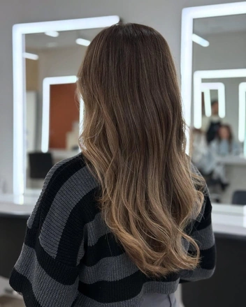 Омбре — это техника, при которой цвет волос постепенно переходит от темного у корней к светлому на концах. Этот стиль не требует частого подкрашивания, поскольку отросшие корни гармонично вписываются в общий образ. Вы можете экспериментировать с различными оттенками и не переживать, что цвет быстро потеряет актуальность (читайте также: Raffia Bronde: кому подходит самое модное окрашивание 2025).