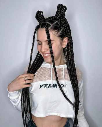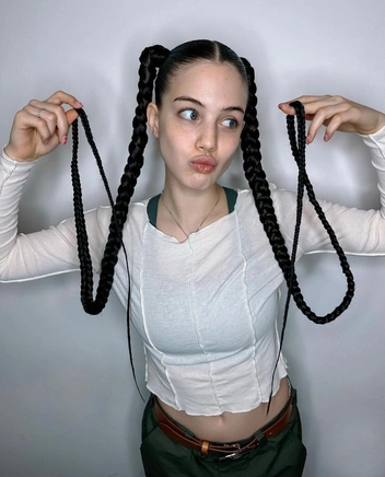 Чтобы повторить прическу, разделите волосы на две части и сделайте два гладких хвоста. Затем заплетите из хвостов несколько мелких косичек и уложите их в пучки. Если из пучков будут выбиваться кончики кос — так даже лучше. Если волосы сильно пушатся, предварительно нанесите на них праймер, чтобы сделать пряди гладкими и послушными.