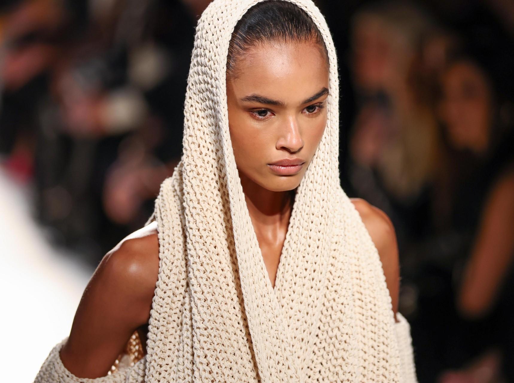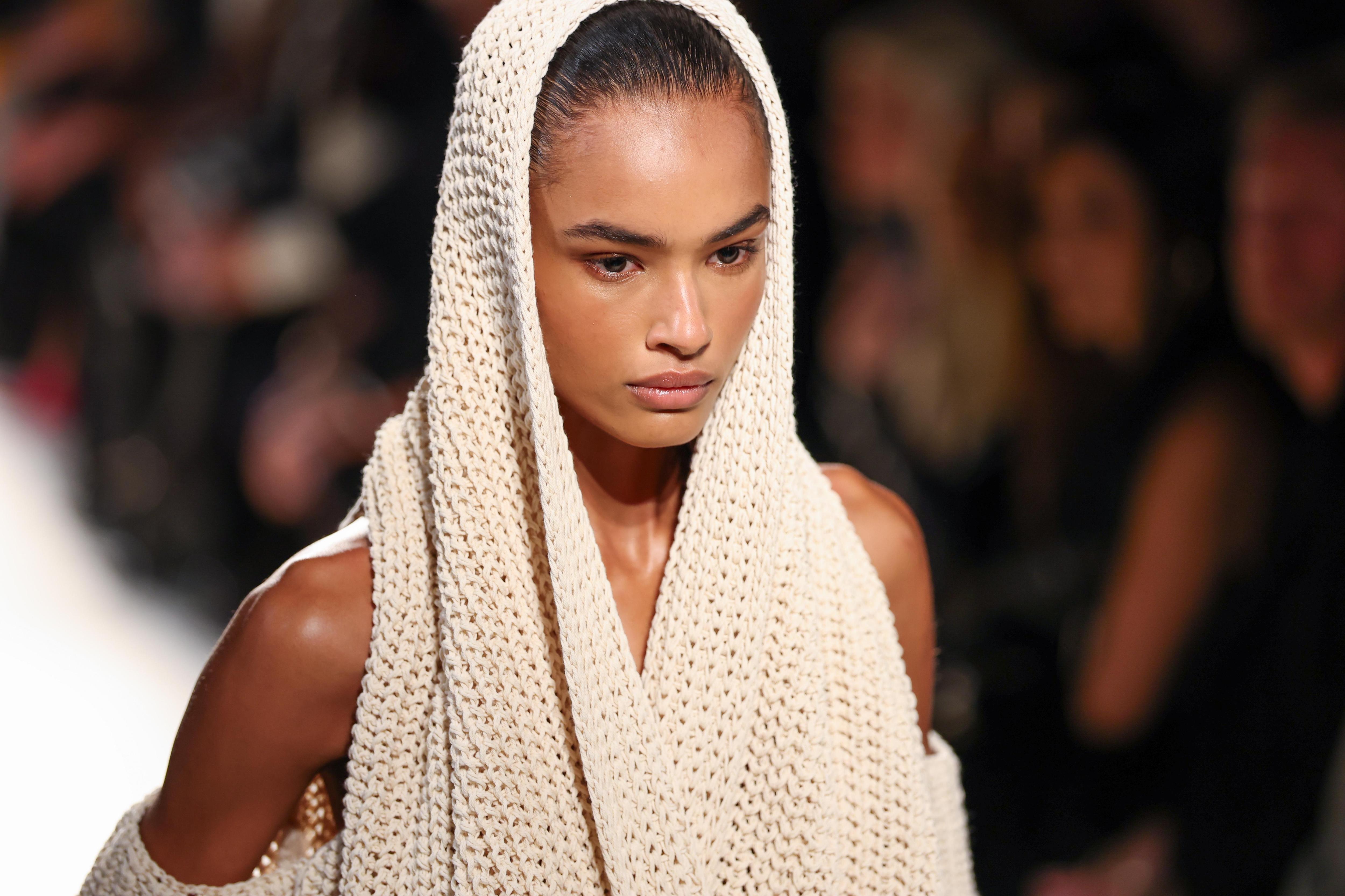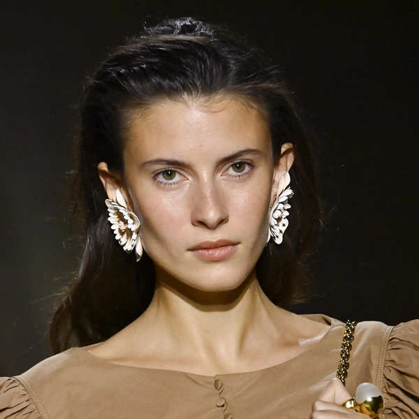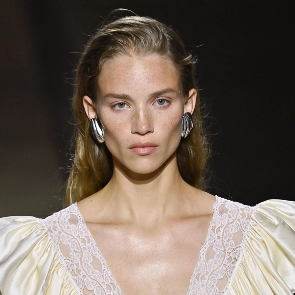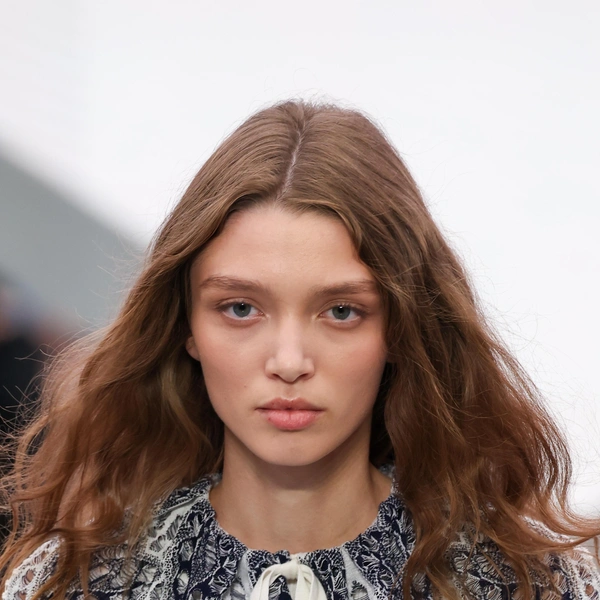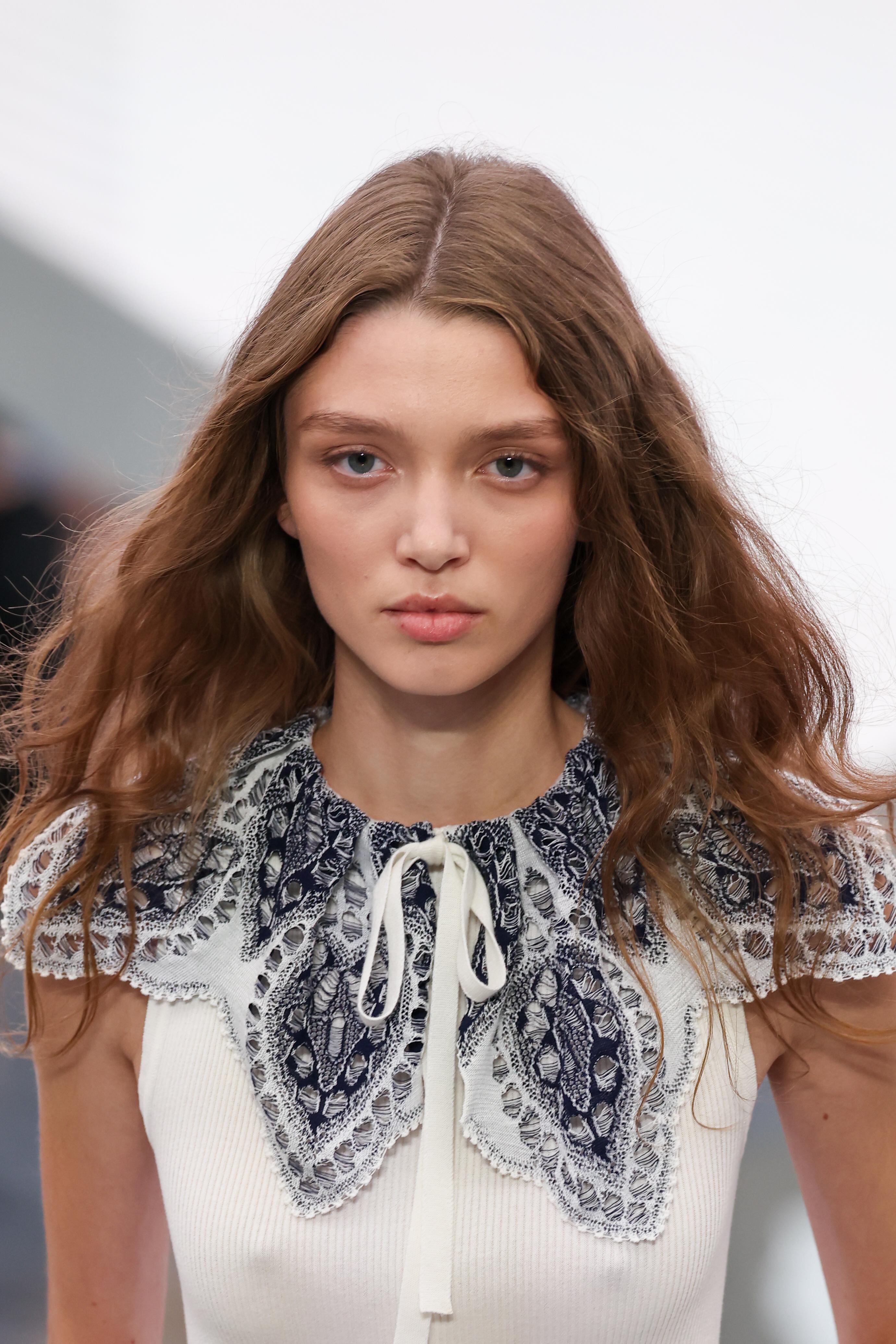 В бэкстейдже Chloé визажисты предварительно готовили кожу LED-терапией и легкими средствами ухода, чтобы добиться гладкости без слоя тонального крема. Вместо хайлайтера использовались кремовые текстуры, в которых блеск появляется не за счет пигмента, а за счет отражения света от поверхности кожи. На подиуме такие лица выглядели не накрашенными, а ухоженными, в этом и заключался замысел.