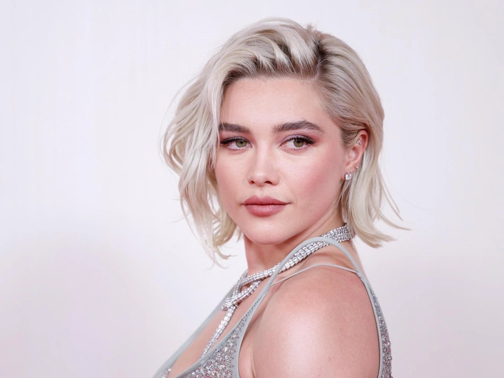 Флоренс Пью также отдала предпочтение небрежной укладке — рваный боб с подчеркнутой текстурой делал ее образ более бунтарским. А дополнял его нежный макияж в розово-фиолетовых оттенках и легкая стрелка.
