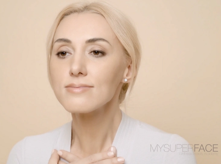 Кладем руку на ключицу, немного выдвигаем нижнюю челюсть и несильно запрокидываем голову назад. После этого нужно сформировать губами форму поцелуя. Задерживайтесь вверху на 2-3 секунды и возвращайтесь обратно. Повторите 20-30 раз.