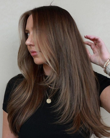 В 2024 году эстетика «тихой роскоши» не покинет нас, по крайней мере в трендах окрашивании. Этот темный насыщенный оттенок с легкими светлым и карамельными бликами делает образ более элегантным. Правильно подобранная техника окрашивания сделает внешний вид волос более ухоженным: локоны будут выглядеть блестящими и мягкими.