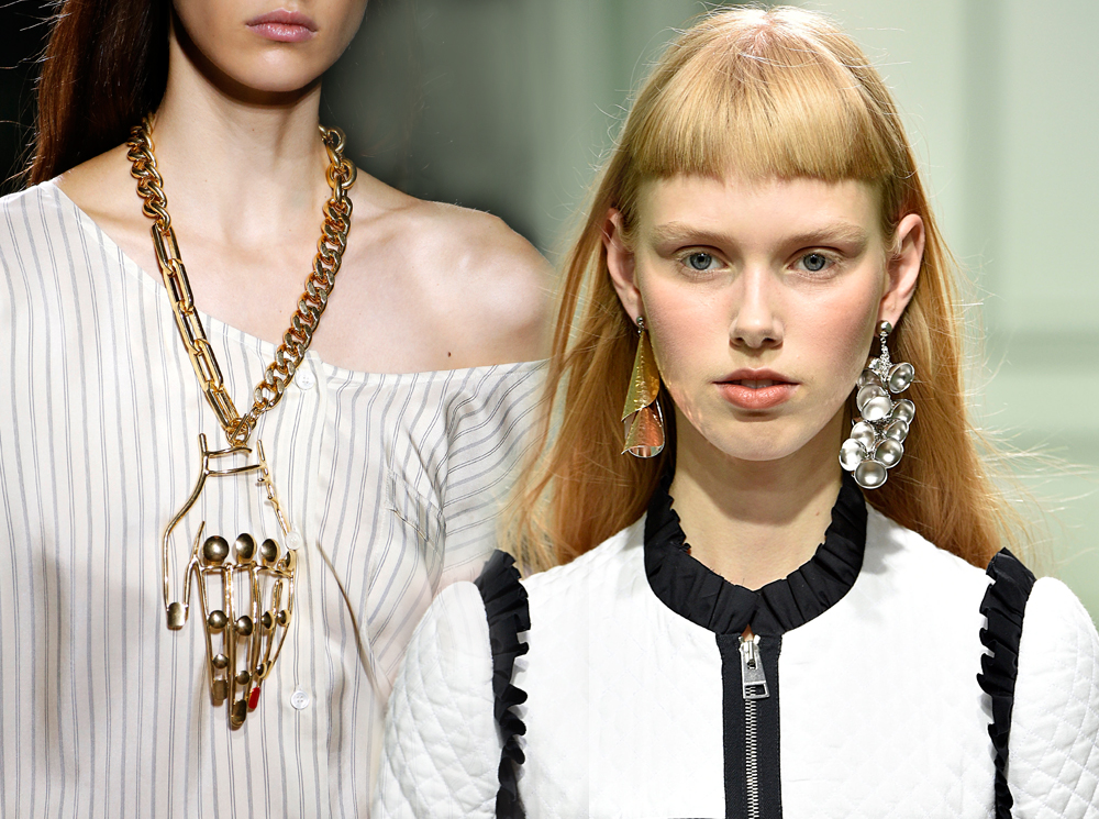 Золото и серебро в украшениях Rodarte дизайнеры умело сочетали вместе, попутно экспериментируя с длиной, а на показе Christian Dior миниатюрные сережки были призваны отдавать дань и тренду на лозунги.