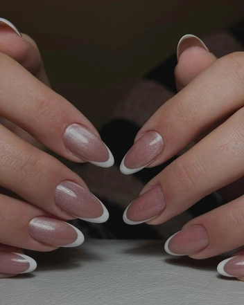 Сатиновый или «стеклянный» френч, как его прозвали на просторах соцсетей, объединяет в себе лучшие характеристики классического французского маникюра и безумно популярного в последние годы покрытия «кошачий глаз». При таком дизайне мастер создает тонкие белые линии на кончике каждого ногтя, а главный трюк заключается в необычном базовом покрытии. Вместо привычного розового или нюдового оттенка на поверхность ногтевой пластины наносится так называемая «шелковая кошка» — магнитный лак с очень мелкими сияющими частицами, из-за чего он визуально напоминает переливы ткани.