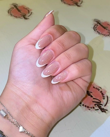 Однако чтобы его повторить недостаточно просто нанести лак. Секрет кроется в работе с магнитом, который способен притягивать и отталкивать блестки. Сначала его приставляют к ногтю с одной стороны, а затем быстро переносят на противоположную. Так получается создать идеальный блик, который и нужен в этом дизайне. Иногда мастера дополнительно проводят магнитом у кончиков пальцев, чтобы перелив исходил именно от них. После на каждом ногте рисуют тонкий френч — эффектнее всего выходит на длинных миндалевидных или овальных ногтях, ведь контрастная линия подчеркивает их изящный изгиб (читайте также: Маникюр на миндальную форму ногтей 2025: добавляем конфетти и не жалеем блесток).