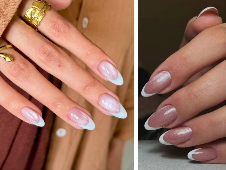 Обычно подобный нейл-арт создают в классической бело-розовой гамме. Однако в соцсетях во всю встречаются и другие варианты. Нюдовый лак с эффектом «кошачий глаз» заменяют на серебристый, голубой или светло-сиреневый, а френч рисуют более контрастными оттенками, например, черным.