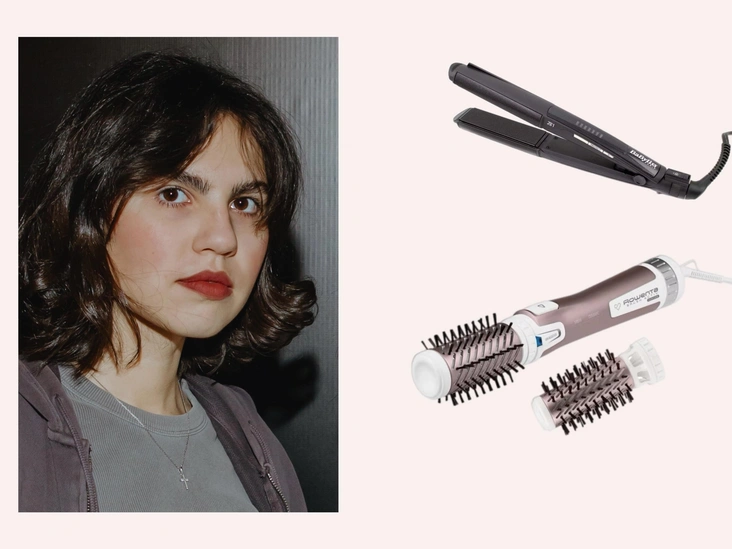 Вооружаюсь плойкой — моя BaByliss 2 in 1 Intense Protect служит уже лет 7 — и начинаю укладку. Важно не пытаться ухватить все волосы разом, а работать с отдельными прядями. Первые два «прохода» — выпрямляю, а на третий закручиваю локон. Челку, предварительно смочив, закручиваю феном-щеткой Rowenta Brush Activ Premium Care: две минуты оборотов от себя, одну — к себе.