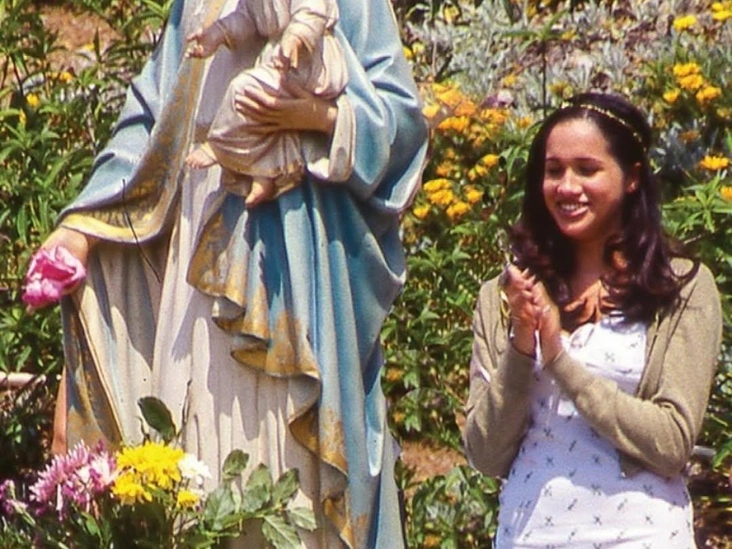 На днях Меган Маркл поделилась редким кадром, сделанным еще в 1999 году. На нем будущая герцогиня, улыбаясь, стоит рядом статуей Девы Марии и будто бы хлопает в ладоши. Будущая супруга принца Гарри в тот день была одета в легкий белый сарафан, поверх которого накинут бежевый кардиган.
