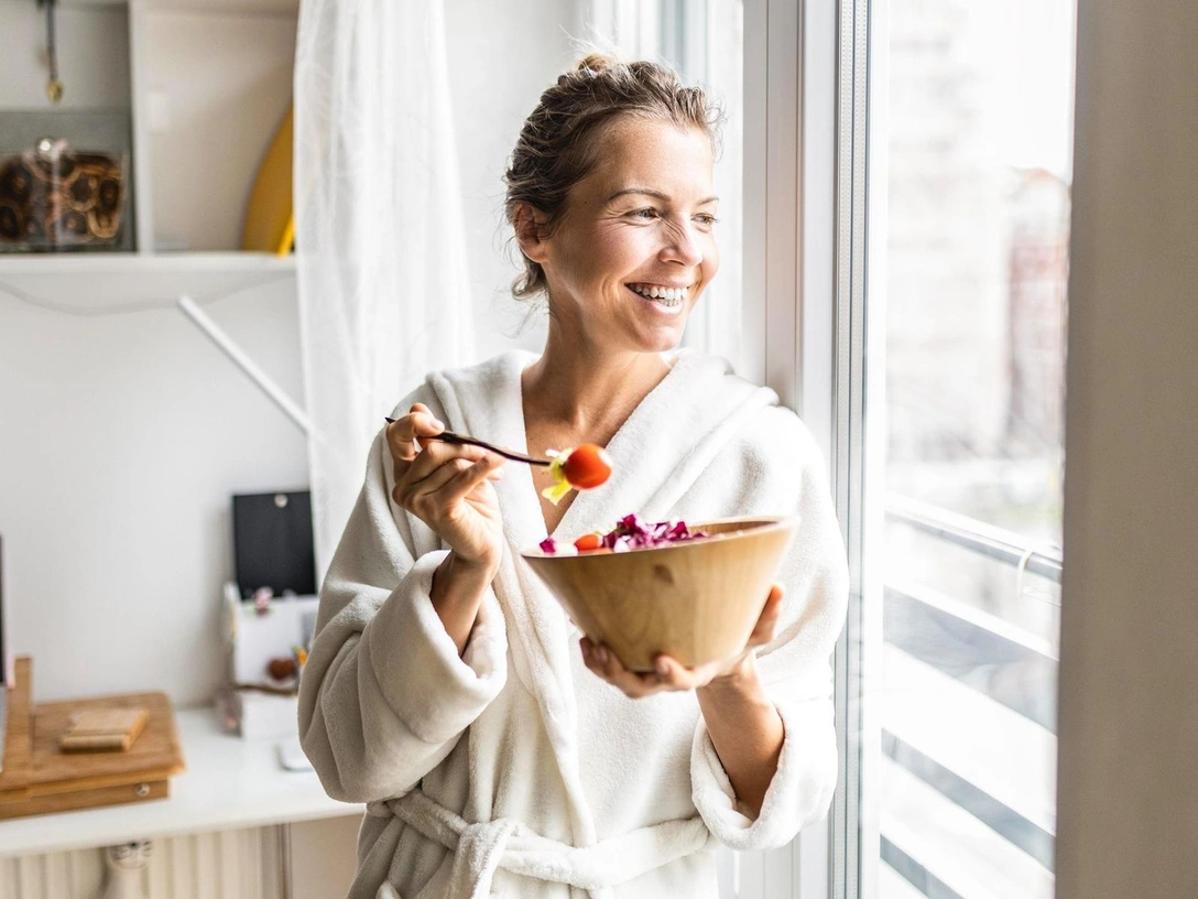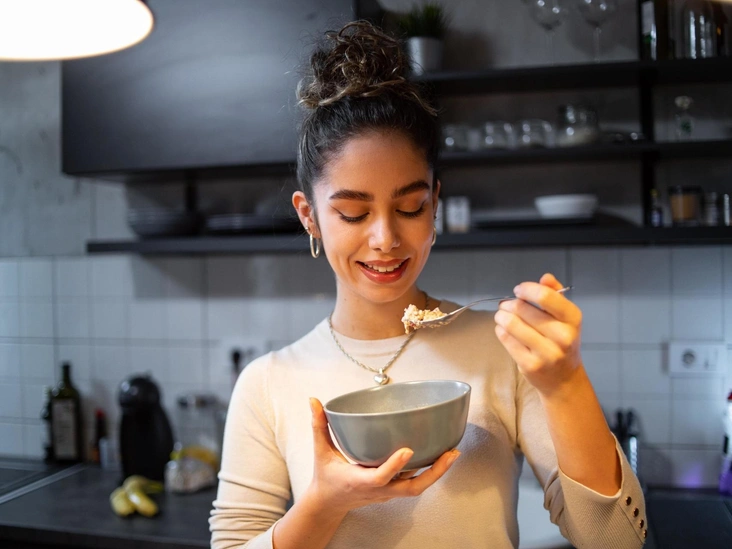 Важно учитывать и состав вашего меню. Дело в том, что пока вы едите, вы тратите энергию на пережевывание пищи и расходуете калории: пока будете жевать несколько морковок — успеете утомиться. Зато вряд ли даже заметите, как в желудке окажется порция макарон.