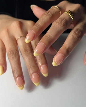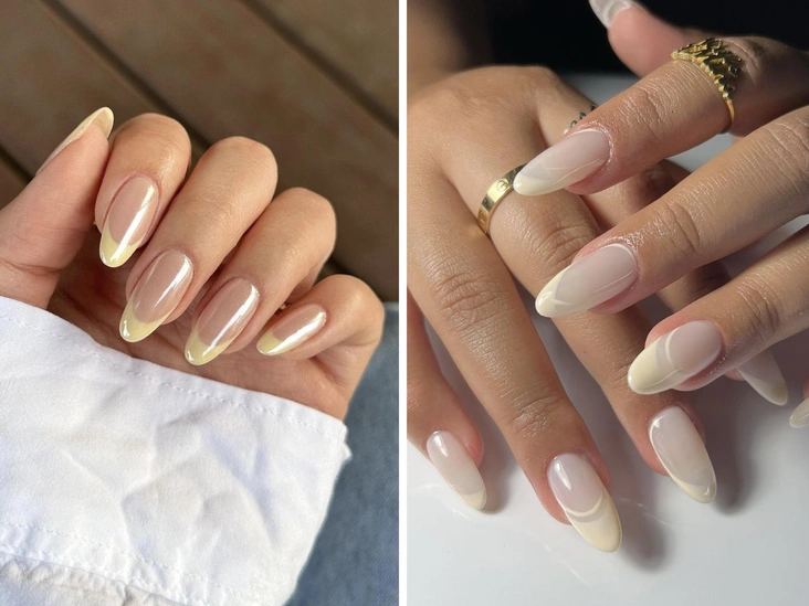 Этот дизайн объединил в себе сразу несколько главных нейл-трендов 2024 года. Сливочно-желтый оттенок, напоминающий масло, в сочетании с французским маникюром и глянцевым, хромированным финишем выглядит необычно и подойдет к каждому образу. Сливочный френч легко сочетать с другими оттенками и дизайнами.