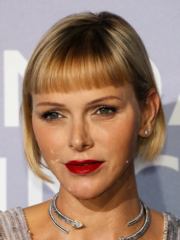 До того, как супруга князя Монако решила обрить один висок и половину затылка, она носила геометричное каре с прямой челкой, отлично смотревшееся с броскими оттенками помады. Темно-алые губы стали отличным акцентом в образе с серебристым платьем и необычным колье, продемонстрированном Шарлен на на гала-концерте в Монако в сентябре 2020-го.