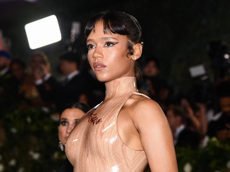Песочное струящееся платье певицы дополнили «кошачьи» стрелки, свежий персиковый румянец и коричневый карандаш для губ — выглядит просто и элегантно. Отдельно хотим отметить маникюр Тайлы: ногти девушки были украшены объемными прозрачными кристаллами, свисающими с каждого пальца.