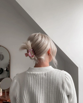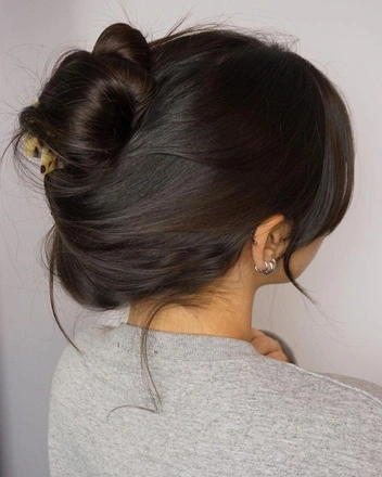 Прически с крабиком выглядят интереснее и женственнее в сочетании с челкой. Соберите волосы заколкой, оставив челку и пару прядей у лица распущенными (читайте также: Как укладывать челку в жару: 5 хитростей, которые помогут продлить свежесть волос). Слегка завейте их на плойку или создайте волны с помощью круглой расчески, в конце сбрызните укладку текстурайзером, чтобы придать ей легкой небрежности.