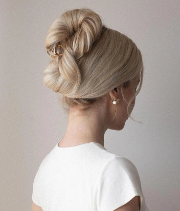 Необычный вариант для тех, кому надоели классические пучки. Чтобы повторить прическу, сделайте из волос жгут и выложите его в форме восьмерки. Прежде чем зафиксировать кончик крабиком, пошевелите укладку пальцами, чтобы она была подвижной. Чтобы сделать «восьмерку» более стойкой, дополнительно зафиксируйте локоны неведимками.