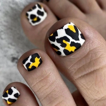 Леопард вышел из моды как в педикюре, так и в маникюре. Такой дизайн также сильно дешевит образ и выглядит безвкусно. Если вам нравятся животные принты, лучше присмотреть к принту зебры в темных и не очень контрастных оттенках лака. Делать такой дизайн лучше только на большом пальце (читайте также: Тренды педикюра 2023: самые популярные оттенки, которые подойдут каждой). Зебра хорошо выглядит в темно-зеленых и темно-синих оттенках.