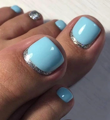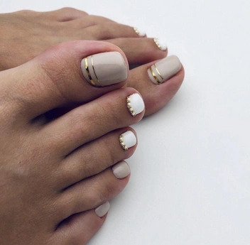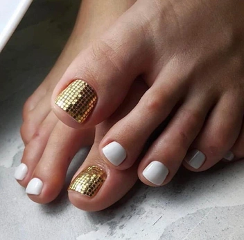 Золотой дизайн с крупным шиммером или с эффектом металлик перешел в антитренды педикюра. Если в маникюре золото выглядит уместно в некоторых дизайнах, то на ногах такой нейл-арт будет дешевить ваш педикюр. С серебром, кстати, тоже лучше экспериментировать осторожно. Если вы сделать педикюр более ярким и сияющим, лучше присмотритесь к серебряному лаку с эффектом металлик, которым можно сделать на большом пальце асимметричные полосы.