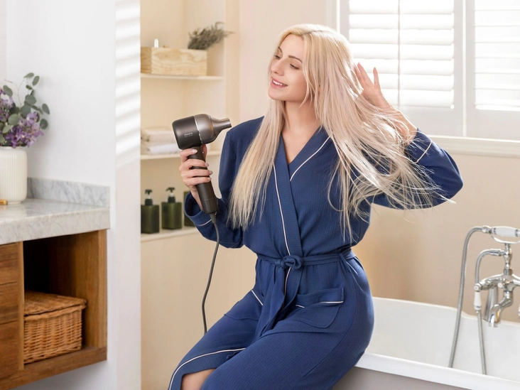 Подача феном воздуха постоянной температуры на уровне 57 °C поможет сохранить внутреннюю влагу волос. Это предотвратит повреждение и выцветание локонов, в том числе возникновение секущихся концов, позволяя сохранить здоровье и гладкость шевелюры. Так вы сможете сберечь структуру и цвет волос на более долгий срок даже при учете использования фена. Впрочем, это не значит, что нужно отказаться от термозащиты для волос: обязательно наносите ее перед тем, как включить фен.
