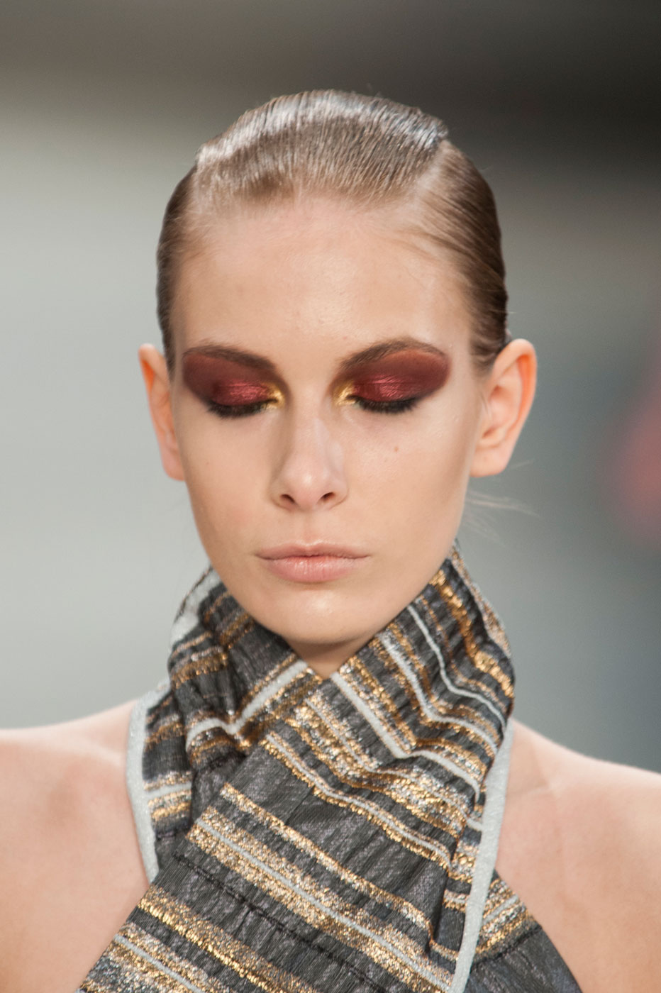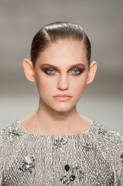 Визажист Ядим (Yadim ) создал макияж в цветах и текстурах тканей коллекции. Он основан на кремовых тенях цвета бургунди и ресницах изумрудного оттенка.