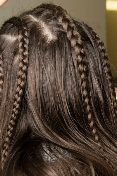Прически на показе Marchesa поражали гостей шоу разнообразием. Один из образов был вдохновлен шотландскими ветрами: волосы девушек собрали в пучок и слегка растрепали. Для другой прически стилисты заплели косички, которые ниже затылочной кости расплели и собрали в хвост или оставили распущенными.