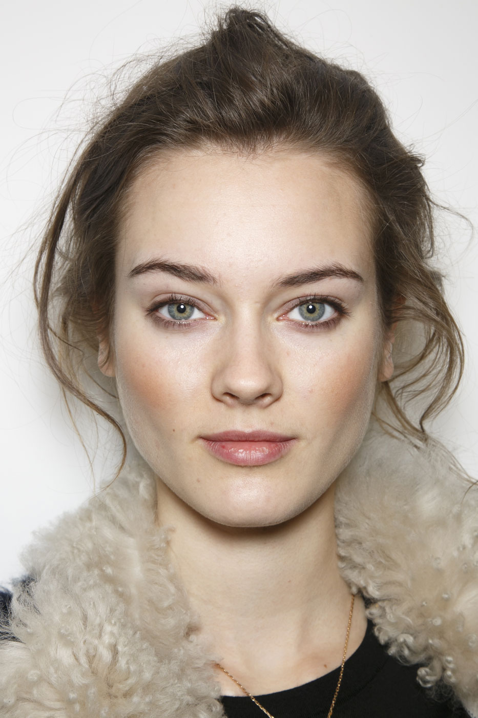 Визажист Дик Пейдж (Dick Page) хотел создать для показа загорелые лица. Для этого он использовал бронзовую пудру, нанося ее на скулы, а остальную часть кожи оттенил полупрозрачной пудрой. Он поделился хитростью: «Театральным трюком было оставить красные точки на внутренних уголках глаз, чтобы сделать взгляд более живым. В современном мейкапе мы наносим яркие цвета и блеск вокруг слезного протока, чтобы подчеркнуть яркость». Визажист признается, что оттенок помады он взял у мужской модели Баптиста Радуфа (Baptiste Radufe), чьи лиловые губы он считает идеальными.