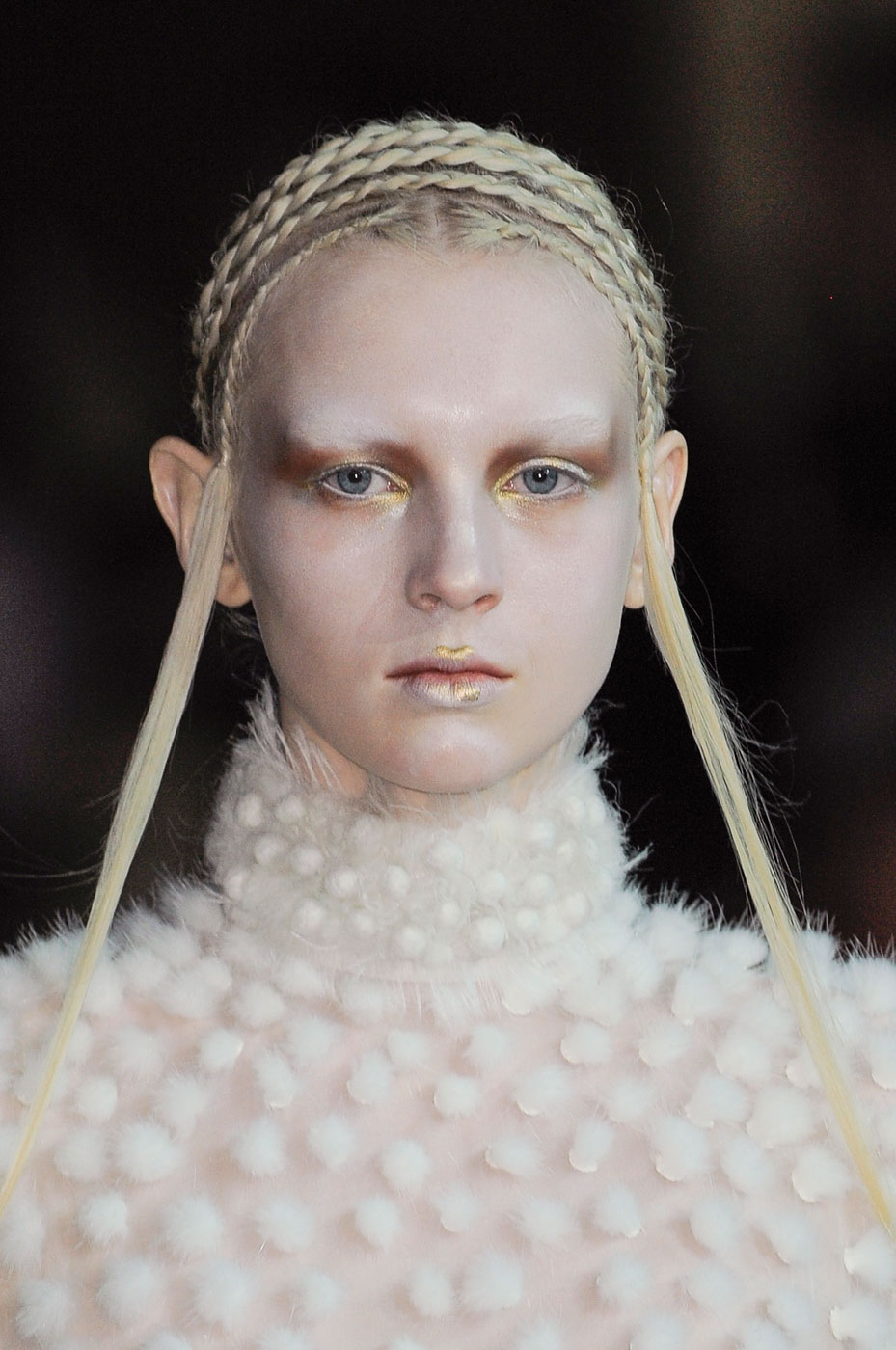 «Такие волосы могут быть из будущего, а могут быть и из прошлого», – сказал перед шоу Гвидо Палау, делая сложную прическу из кос. Для ее создания он разделил волосы на прямой пробор и сплел нечто вроде корзины из косичек вокруг головы, оставив несколько прядей незаплетенными и свисающими у висков. «Этот способ – то, что Александр действительно любил. Он обожал экстрим и крайности», – добавил стилист.