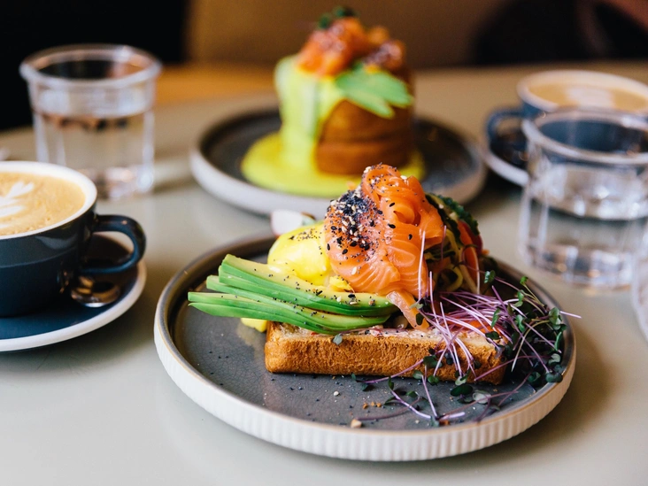 Переложите хлеб на тарелку, выложите на него ломтики рыбы, потом авокадо.