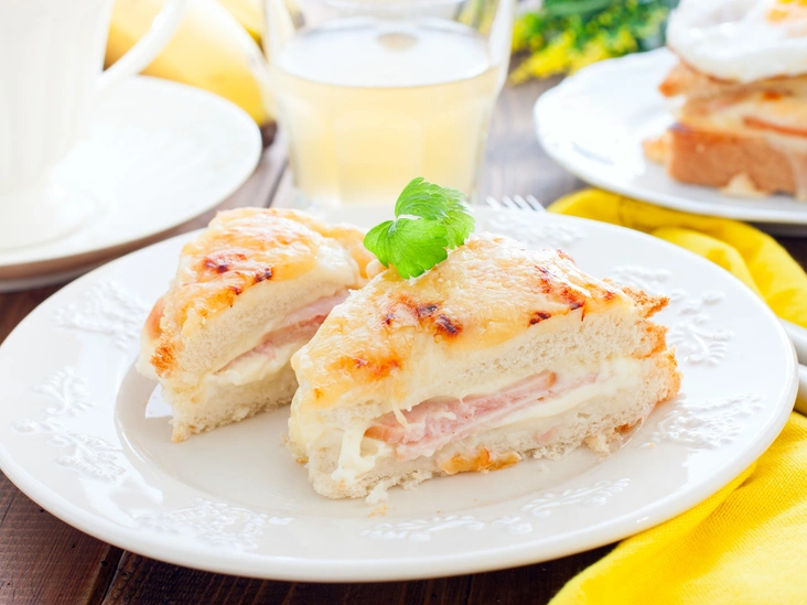 Смажьте хлеб соусом. Положите сверху ветчину и сыр, накройте вторым кусочком и уберите обратно в духовку примерно на 5 минут, пока сыр не расплавится.