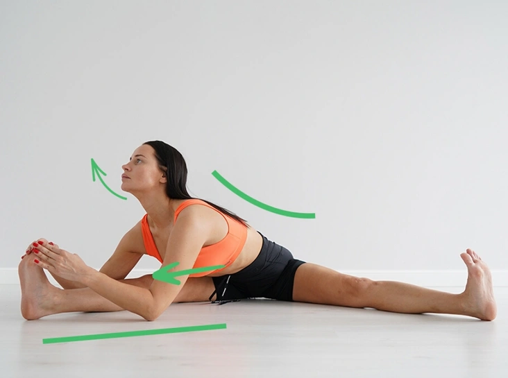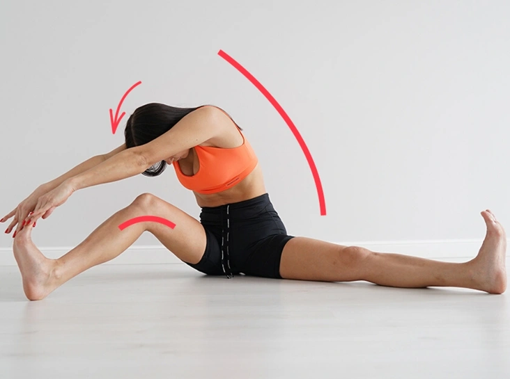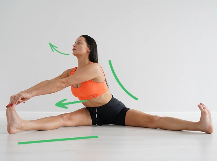 К бедру нужно тянуться не головой, а именно животом с раскрытой грудной клеткой. Это позволит хорошо прочувствовать мышцы ног и поясницы.
