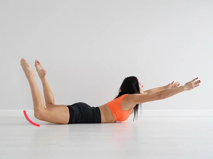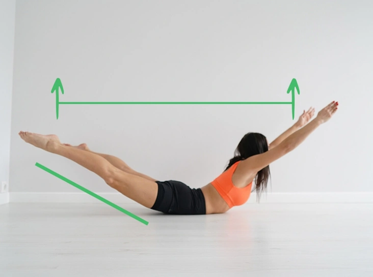 Упражнение: руки и ноги выпрямляем и одновременно поднимаем вверх на один уровень, не соединяя друг с другом. Сначала будет сложно, поэтому важно не количество, а качество. Поднимите корпус вверх 20 раз, затем задержите положение на 10 счетов. В идеале сделать 2-3 подхода.