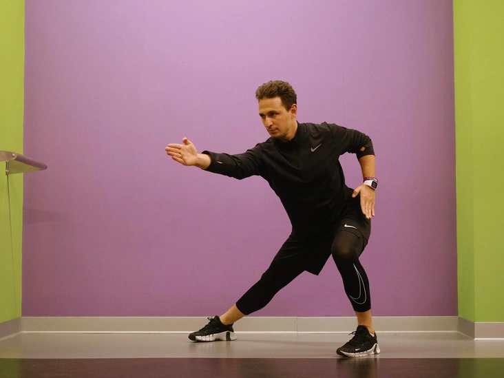 Выполните длинный шаг левой ногой в сторону, согните колено, а правую ногу оставьте прямой. В этом упражнении отлично задействуются мышцы внутренней поверхности бедра, а если правой рукой потянуться вперед, то это усилит эффект. Сделайте 10–20 повторений, чередуя стороны, и не забывайте контролировать технику.