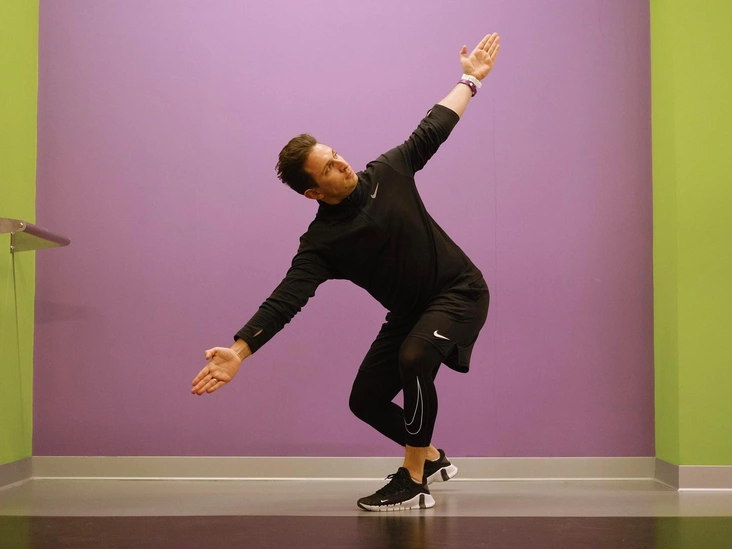 Выполните длинный шаг левой ногой в сторону, согните колено, а правую ногу оставьте прямой. В этом упражнении отлично задействуются мышцы внутренней поверхности бедра, а если правой рукой потянуться вперед, то это усилит эффект. Сделайте 10–20 повторений, чередуя стороны, и не забывайте контролировать технику.