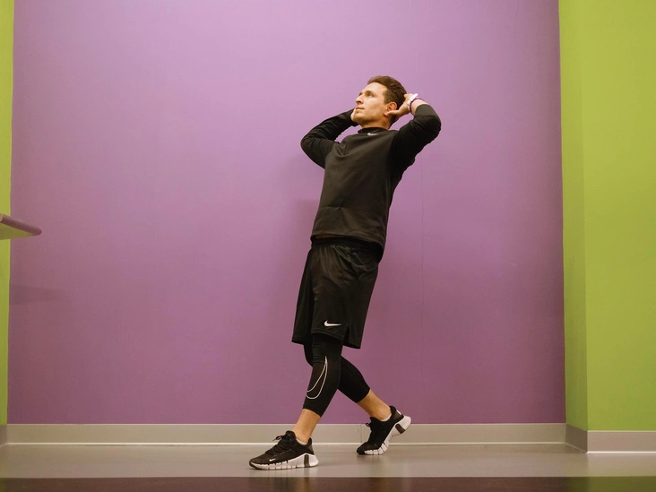 Из исходного положения стоя выполните шаг правой ногой назад, корпус старайтесь сохранить на одной вертикальной линии. Целевая группа — мышцы брюшного пресса. Упражнение отлично развивает динамическую стабилизацию и по эффекту схоже с планкой, но в вертикальной позиции: это тренирует способность сохранять стабильное положение в пояснице. Для более сильного ощущения в момент шага назад заведите обе руки за голову и сопроводите данное действие выдохом. Контролируя технику, выполните 10–20 повторений с чередованием сторон.