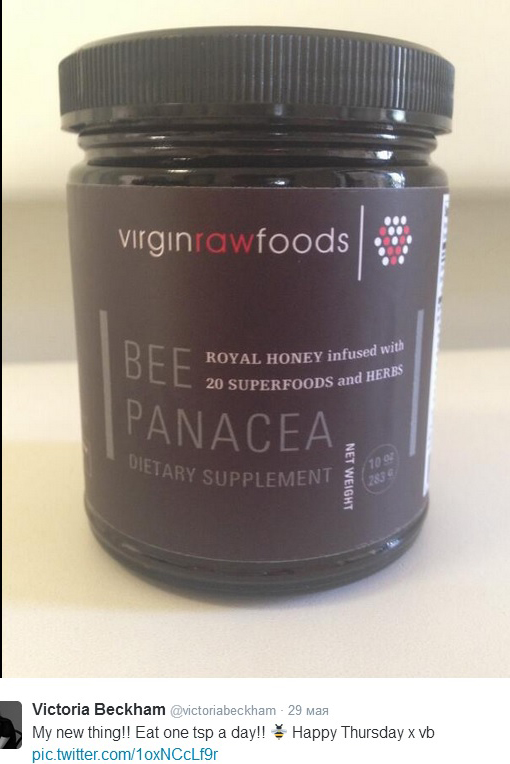 Другое средство, которым пользуется Виктория Бекхэм, – комплекс Bee panacea. Это средства на основе продуктов пчеловодства: меда, пыльцы, прополиса, маточного молочка, также в нем содержатся водоросли, травы и пробиотики. Эти средства обладают комплексом витаминов и минералов, в том числе фолиевой кислотой. Виктория признается, что пчелиная пыльца повышает уровень энергии, помогает снять кожные воспаления и действует как афродизиак.