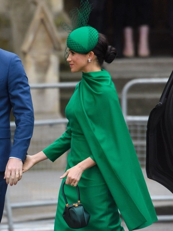 Свое самое последнее официальное мероприятие в качестве действующего члена королевской семьи — службу в честь Дня Содружества — жена принца Гарри провела в запоминающемся зеленом ансамбле (позже в документальном сериале «Гарри и Меган» она признается, что впервые решилась на эксперименты с цветом именно в это время). Под аккуратной шляпкой с вуалью скрывалась гладкая прическа с тщательно уложенным низким пучком, уложенным жгутом.
