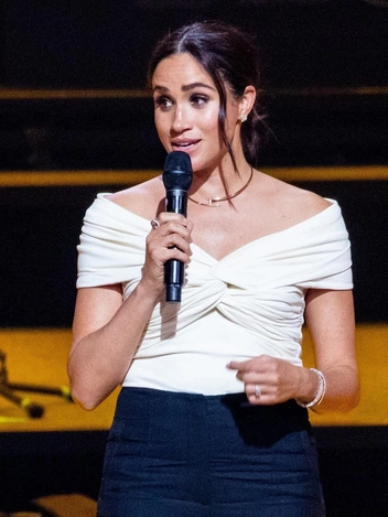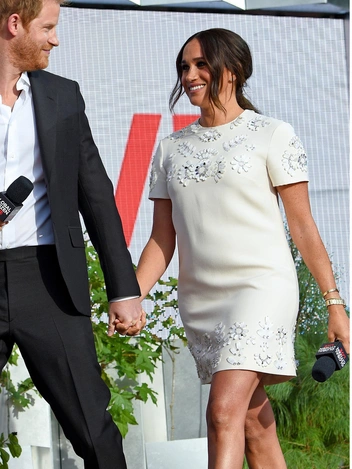 На дневных мероприятиях Invictus Games в Гааге герцогиня Сассекская появлялась в основном с аккуратно уложенными волосами, а вот для церемонии открытия она выбрала низкий пучок — при этом намного более небрежный, чем предпочитала в случае придворных мероприятий.