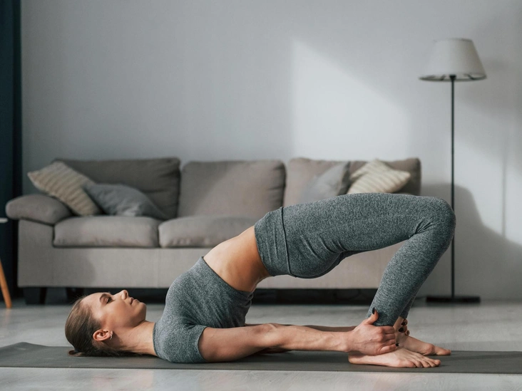 Чтобы принять позу моста, лягте на пол. Затем поднимите ноги в коленях и живот, но не поднимайте плечи, голову и шею.