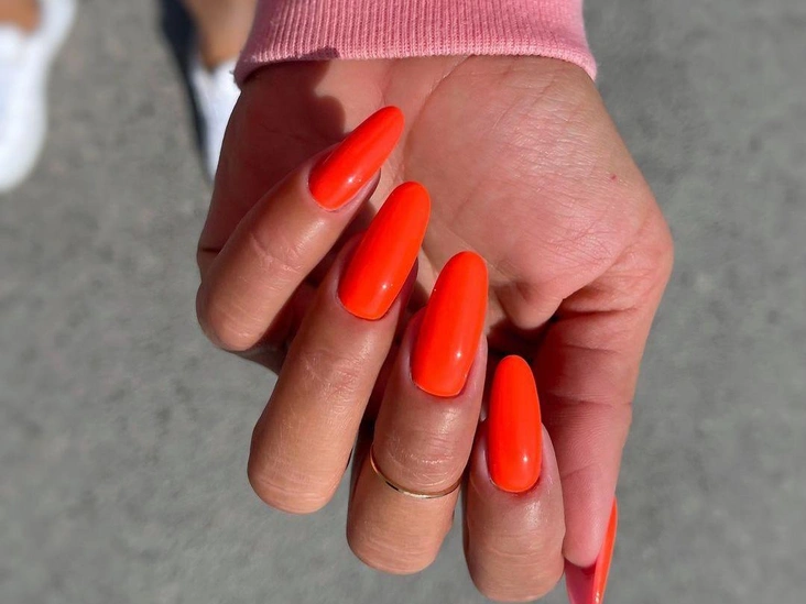 Не советуем делать оранжевый маникюр даже в отпуск: покрытие выглядит дешево и неопрятно (особенно в сочетании с длинными ногтями). Заменить его можно розовыми, красными или фиолетовыми лаками, которые удачно сочетаются с ногтями любой формы и длины.