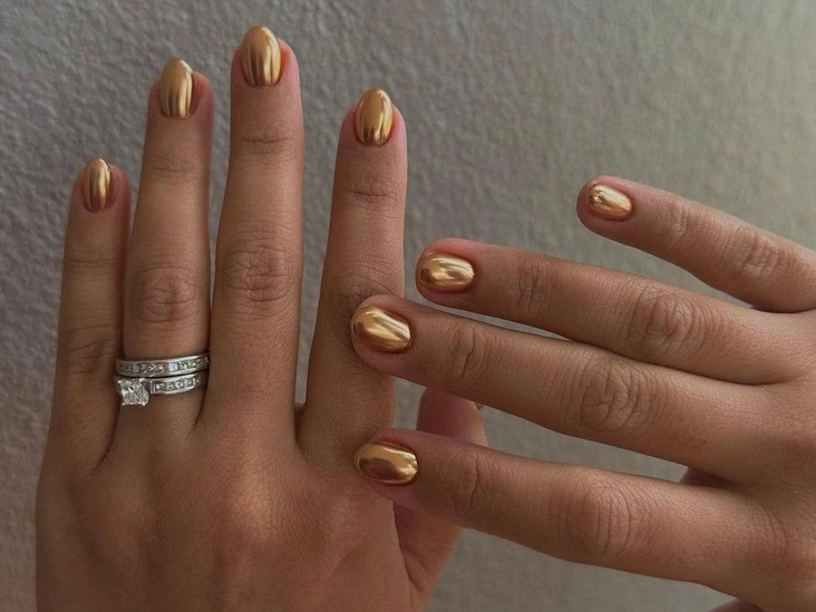 Золотое покрытие в большинстве случаев выглядит вычурно и вызывающе. Исключения — поталь, небольшие акценты и французский маникюр в сочетании с нюдовыми лаками. В качестве альтернативы попробуйте серебряные лаки и покрытие с эффектом металлик, которые красиво переливаются на ногтях, но про этом не выглядят чересчур ярко.